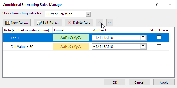 - Conflicting Rules: Sometimes multiple conditional formatting rules in Excel conflict. A higher rule always wins. This example illustrates two different results.
