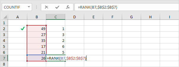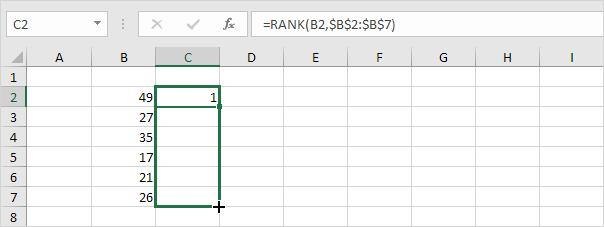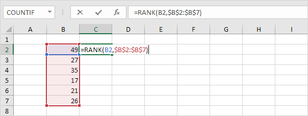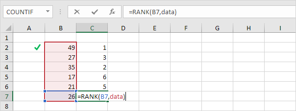 2. Now you can use this named range in your formulas. Select cell C2, enter the RANK function shown below and copy this formula to the other cells.