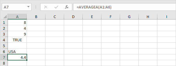 The AVERAGEA function also returns the average (arithmetic mean) of a group of numbers. However, the logical value FALSE and cells that contain text evaluate to 0 and the logical value TRUE evaluates to 1. The AVERAGEA function also ignores empty cells.