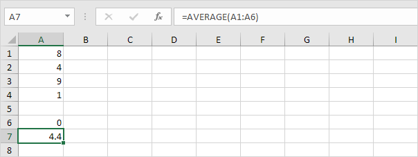 1. For example, the AVERAGE function below calculates the average of the numbers in cells A1 through A3.