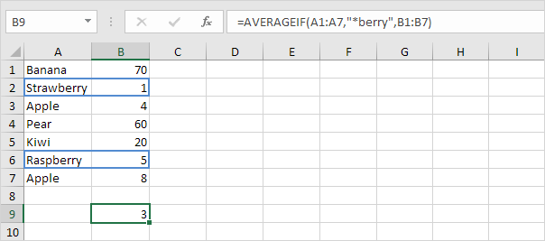 4. The AVERAGEIF function below calculates the average of all values in the range B1:B7 if the corresponding cells in the range A1:A7 contain a series of zero or more characters + berry. An asterisk (*) matches a series of zero or more characters.