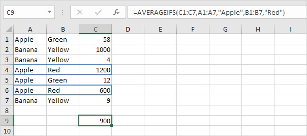 7. The AVERAGEIFS function below calculates the average of all values in the range C1:C7 if the corresponding cells in the range A1:A7 contain exactly Apple and the corresponding cells in the range B1:B7 contain exactly Red.