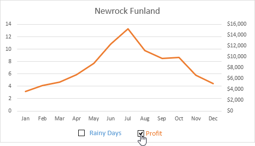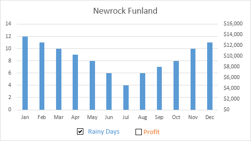 1. For example, create a combination chart with two data series (Rainy Days and Profit).