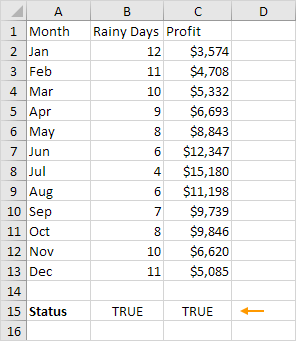 5. Uncheck the second checkbox. Cell C15 below changes to FALSE.