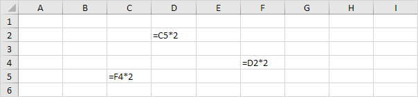 8. Cell D2 refers to cell C5. Cell C5 refers to cell F4. Cell F4 refers back to cell D2.