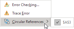 3. Click Circular References. Excel shows the cell address of one circular reference.