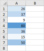 Explanation: by default, for 3-Color scales, Excel calculates the 50th percentile (also known as median, middle value or midpoint). The cell that holds the minimum value (9) is colored red. The cell that holds the median (36) is colored yellow, and the cell that holds the maximum value (80) is colored green. All other cells are colored proportionally.