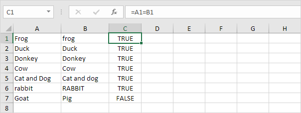 Explanation: this formula ignores lowercase and uppercase differences. As a result, the first six formulas return TRUE.
