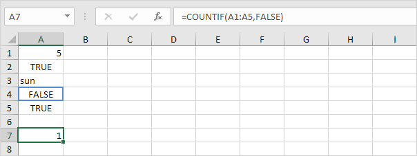 2. The COUNTIF function below counts the number of cells that contain the Boolean FALSE.
