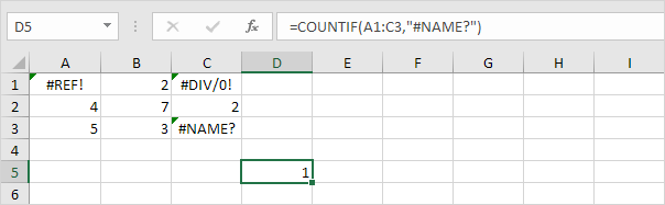 1. The COUNTIF function below counts the number of cells that contain the #NAME? error.
