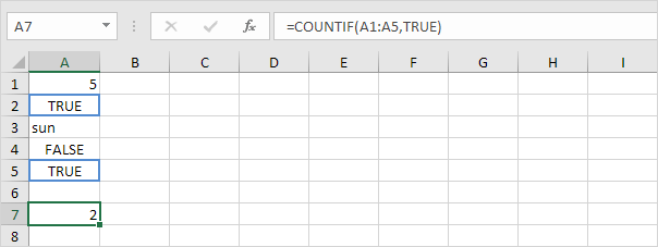 1. The COUNTIF function below counts the number of cells that contain the Boolean TRUE.