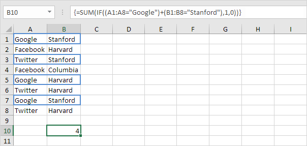 1. For example, to count the number of rows that contain Google and Stanford, simply use the COUNTIFS function.