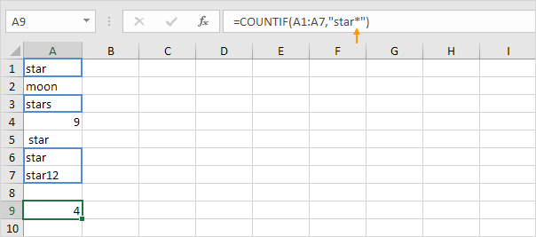 3. The COUNTIF function below counts the number of cells that contain exactly star + a series of zero or more characters. An asterisk (*) matches a series of zero or more characters.