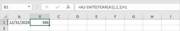 Explanation: dates and times are stored as numbers in Excel and count the number of days since January 0, 1900. June 23, 2024 is the same as 45466. January 1, 2024 is the same as 45292. Subtracting these numbers and adding 1 gives the day of the year. 45466 - 45292 + 1 = 174 + 1 = 175.