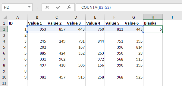 6. Add a Blanks column and insert the COUNTA function.