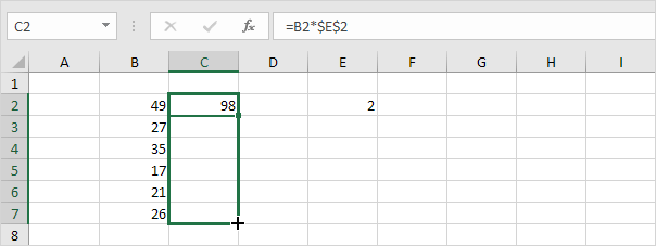 2. To quickly copy the formula in cell C2 to the other cells, select cell C2, click on the lower right corner of cell C2 and drag it down to cell C7.