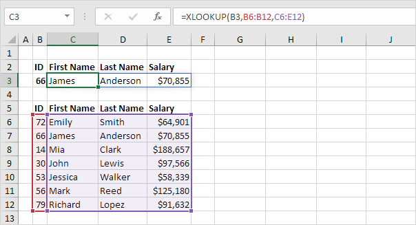 6. The XLOOKUP function below looks up the ID and returns the first name, last name and salary.