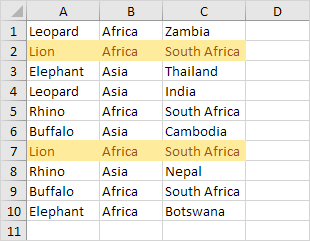 Explanation: if COUNTIFS(Animals,$A1,Continents,$B1,Countries,$C1) > 1, in other words, if there are multiple (Leopard, Africa, Zambia) rows, Excel formats cell A1. Always write the formula for the upper-left cell in the selected range (A1:C10). Excel automatically copies the formula to the other cells. We locked the reference to each column by placing a $ symbol in front of the column letter ($A1, $B1 and $C1). As a result, cell A1, B1 and C1 contain the same formula, cell A2, B2 and C2 contain the formula =COUNTIFS(Animals,$A2,Continents,$B2,Countries,$C2)>1, etc.