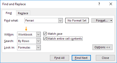 6. Checking 'Match entire cell contents' will only find cells which contain exactly "Ferrari". For example, cells that contain "Car Ferrari", "Ferrarii" or even "Ferrari " will not be found.