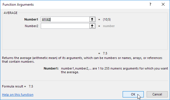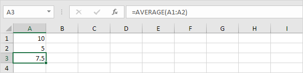 Note: the formula =(A1+A2)/2 gives the exact same result. Functions are predefined formulas and are already available in Excel. Visit our popular section about functions to learn more about this important Excel topic.