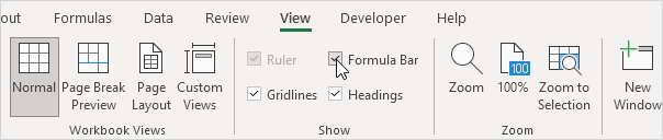 Note: to hide the formula bar, uncheck the Formula Bar box. Sometimes this can be useful if you want to view more of your worksheet area.