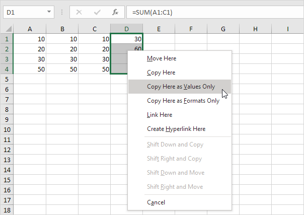 7. Release the right mouse button. From the popup-menu, click Copy Here as Values Only.