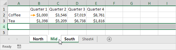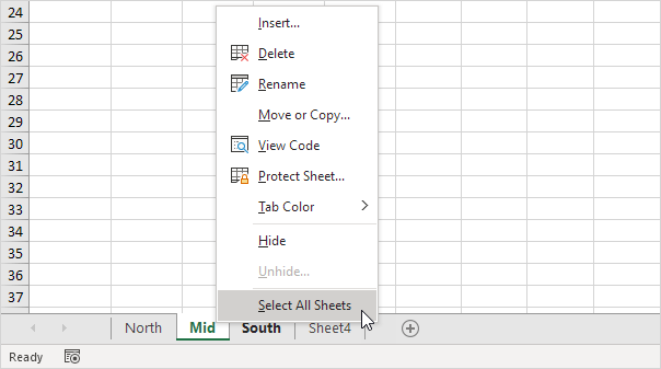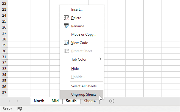 Group worksheets in Excel to edit multiple worksheets at the same time. Our workbook contains 3 similar worksheets (North, Mid and South) and a blank fourth worksheet.