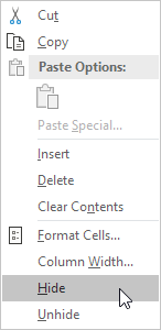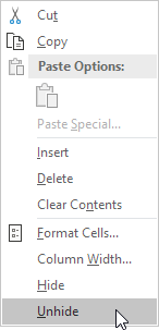 Note: to unhide a row, select the rows on either side of the hidden row, right click, and then click Unhide.