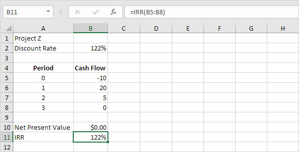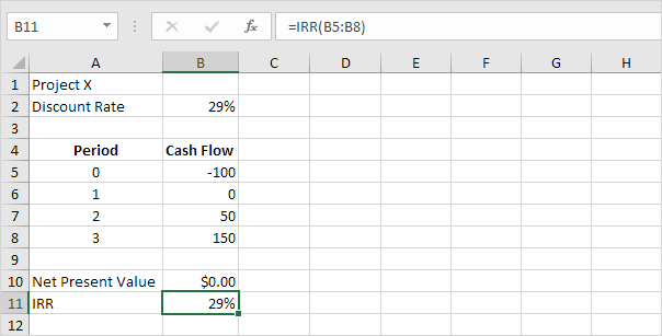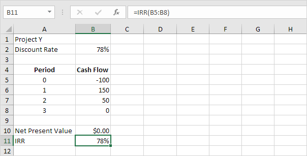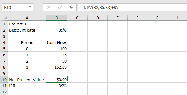 For example, project B requires an initial investment of $100 (cell B5). We expect a profit of $25 at the end of the first period, a profit of $50 at the end of the second period and a profit of $152.09 at the end of the third period.