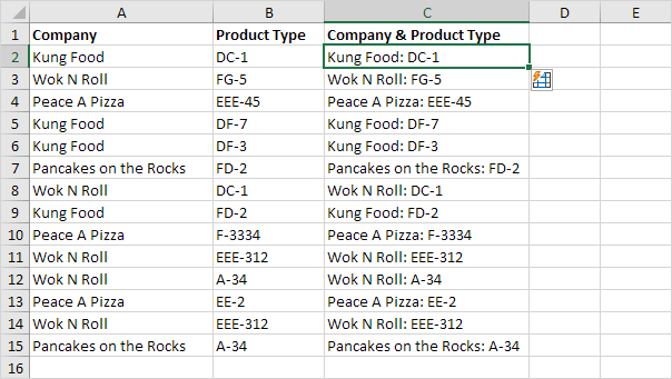 8. For example, select cell C2 below. Type the company name and the product type. We used a colon (:) and a space, but you can use any delimiter.