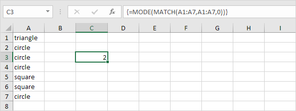 2. To find the position of the most frequently occurring word (don't be overwhelmed), we add the MODE function and replace A7 with A1:A7.