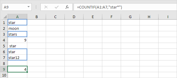 Explanation: an asterisk (*) matches a series of zero or more characters. Visit our page about the COUNTIF function for more information and examples.