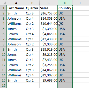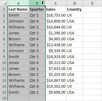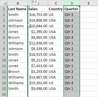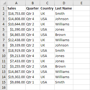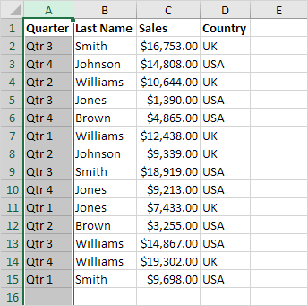 3. Use the first row to indicate the new order of the columns (Sales, Quarter, Country, Last Name).