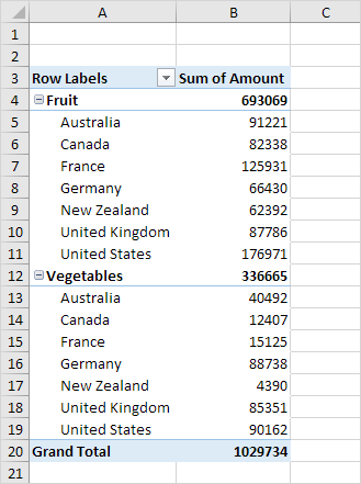1. Category field and Country field to the Rows area.