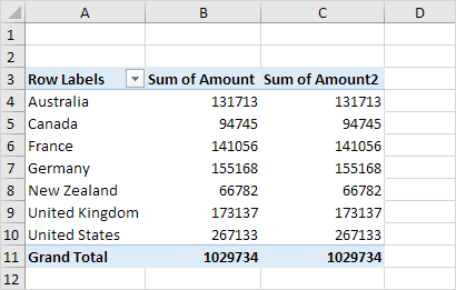 Note: if you drag the Amount field to the Values area for the second time, Excel also populates the Columns area.