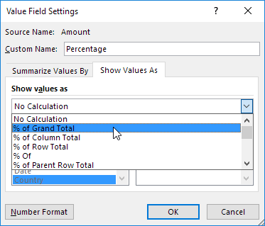 6. On the Show Values As tab, select % of Grand Total.