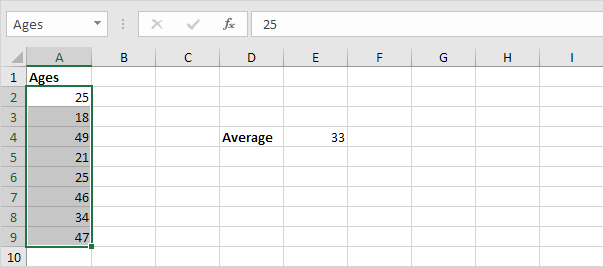 7. Finally, click the drop-down arrow in the name box to see a list of all the named ranges in a workbook. For example, click Ages.