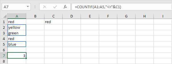 5. The COUNTIF function below produces the exact same result. The & operator joins the 'not equal to' operator and the text value in cell C1.