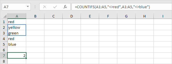 6. The COUNTIFS function below counts the number of cells in the range A1:A5 that are not equal to "red" and not equal to "blue".