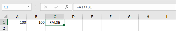 2. The formula in cell C1 below returns FALSE because the value in cell A1 is equal to the value in cell B1.