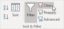 1. First, to remove the previously applied filter, on the Data tab, in the Sort & Filter group, click Clear.