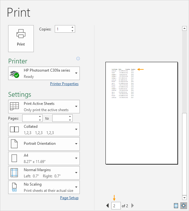 2. To repeat row 1 at the top of each printed page, click in the corresponding box and select row 1.
