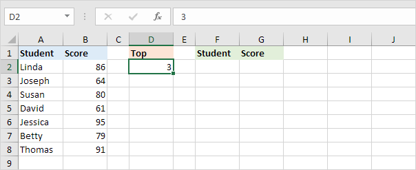 5. We want to show the top 3 results. Enter the value 3 into cell D2.