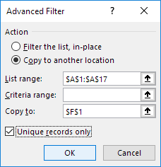 Note: at step 8, instead of selecting the range A1:A17, select the range A1:D17 to extract unique rows.
