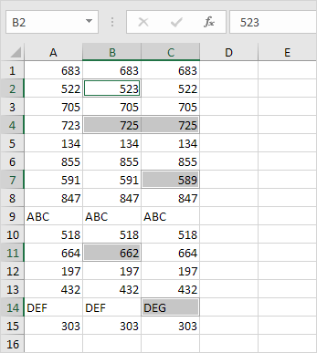 For row 2, Excel selects cell B2 because 523 is not equal to the value in cell A2 (522). For row 4, Excel selects cell B4 and cell C4 because 725 is not equal to the value in cell A4 (723), etc.