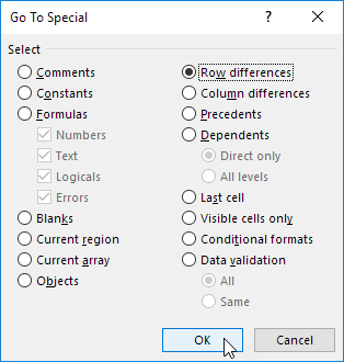 Note: because we selected the range A1:C15 by clicking on cell A1 first, cell A1 is the active cell (Use ENTER and TAB to change the active cell). As a result, the comparison cells are in column A.