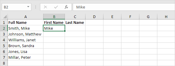 1. First, tell Excel what you want to do by entering the first name Mike into cell B2.