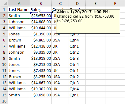 Apparently, Aiden has changed the Sales of Smith from $16,753.00 to $26,753.00.