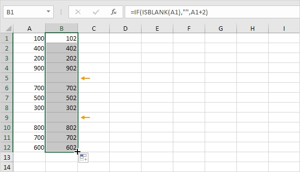 3. Select cell B1 and replace the formula =A1+2 with =IF(ISBLANK(A1),"",A1+2). Next, use the fill handle again to quickly copy this new formula down the column.