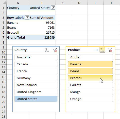 Conclusion: bananas are our main export product to the United States. The report filter (cell B1) changes to United States.